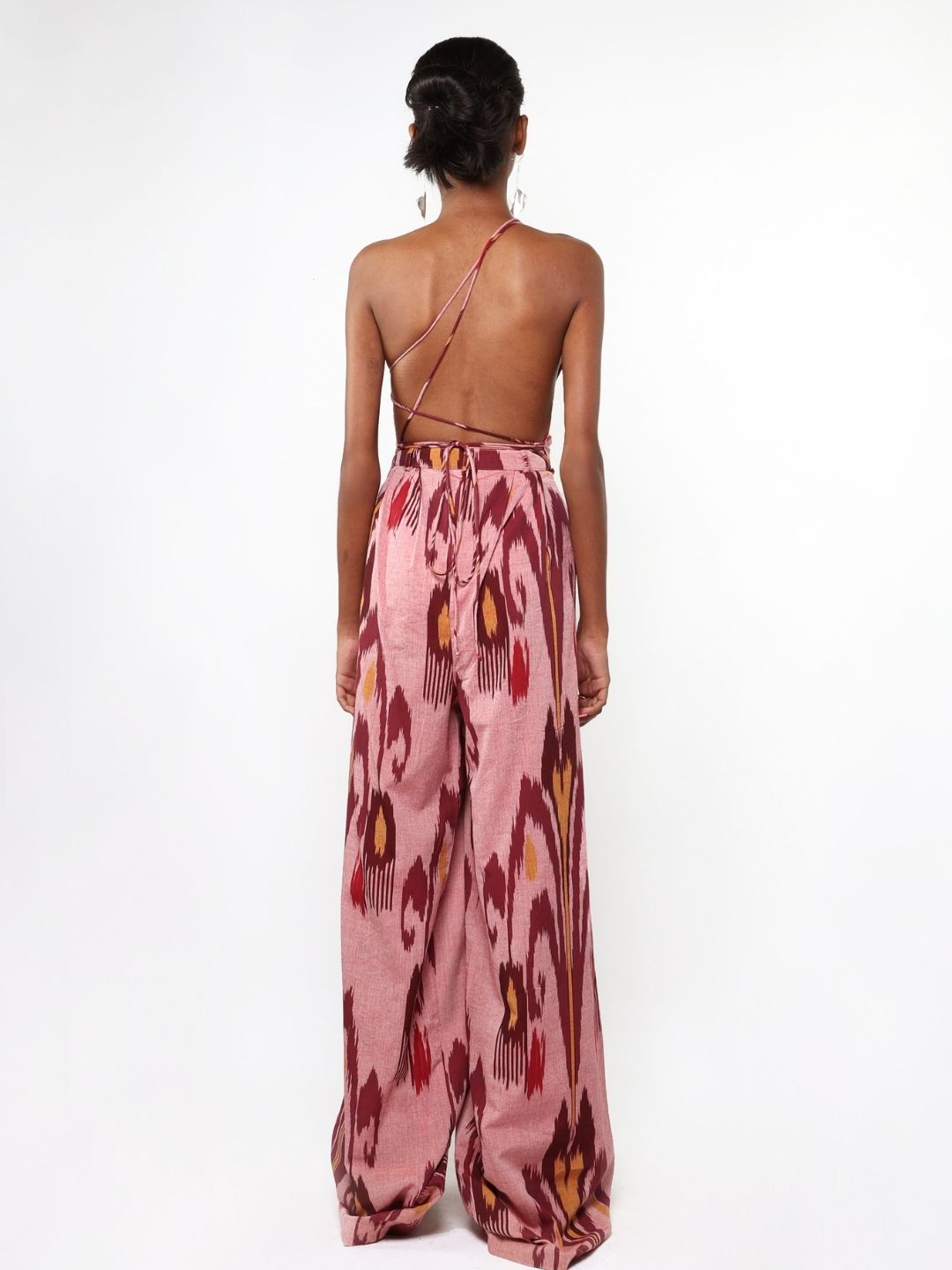 Description-Introducing our exquisite ember tie-up top set, crafted from handwoven Ikat fabric. This stunning ensemble features a tie-up top with an abstract hem adorned with intricate antique gold zari work on the Ikat motif, beautifully executed by our talented embroiderer, Chand Ji. The wide baggy pants are designed with a unique dori detail on the left side, creating a chic ripped effect.