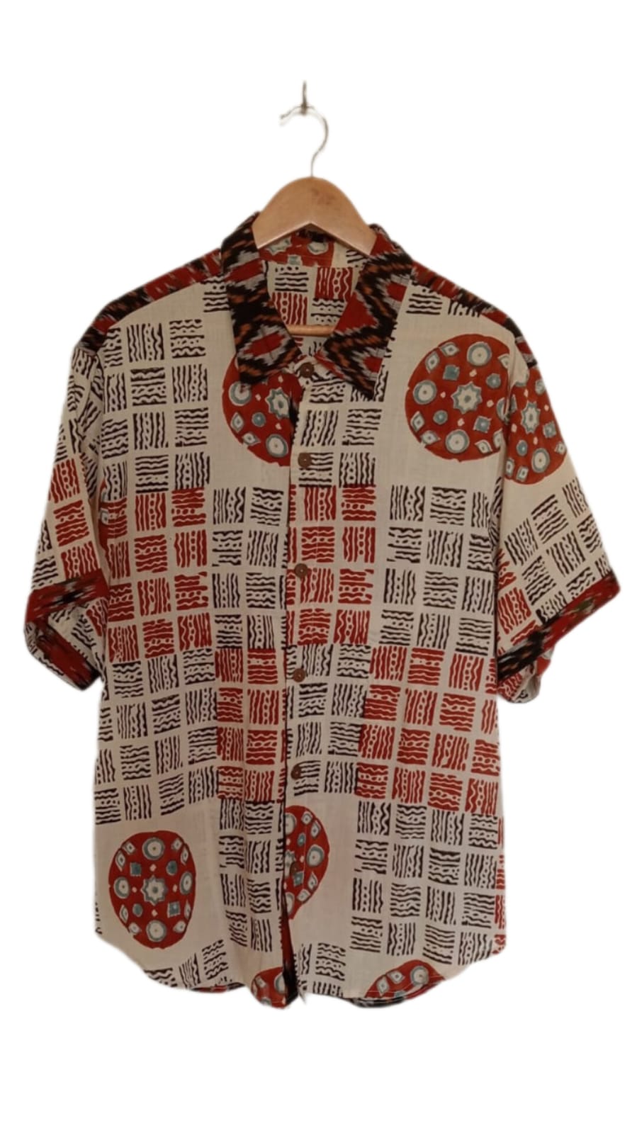 Description: the perfect weekend shirt for him or her, hand block printed with natural dyes