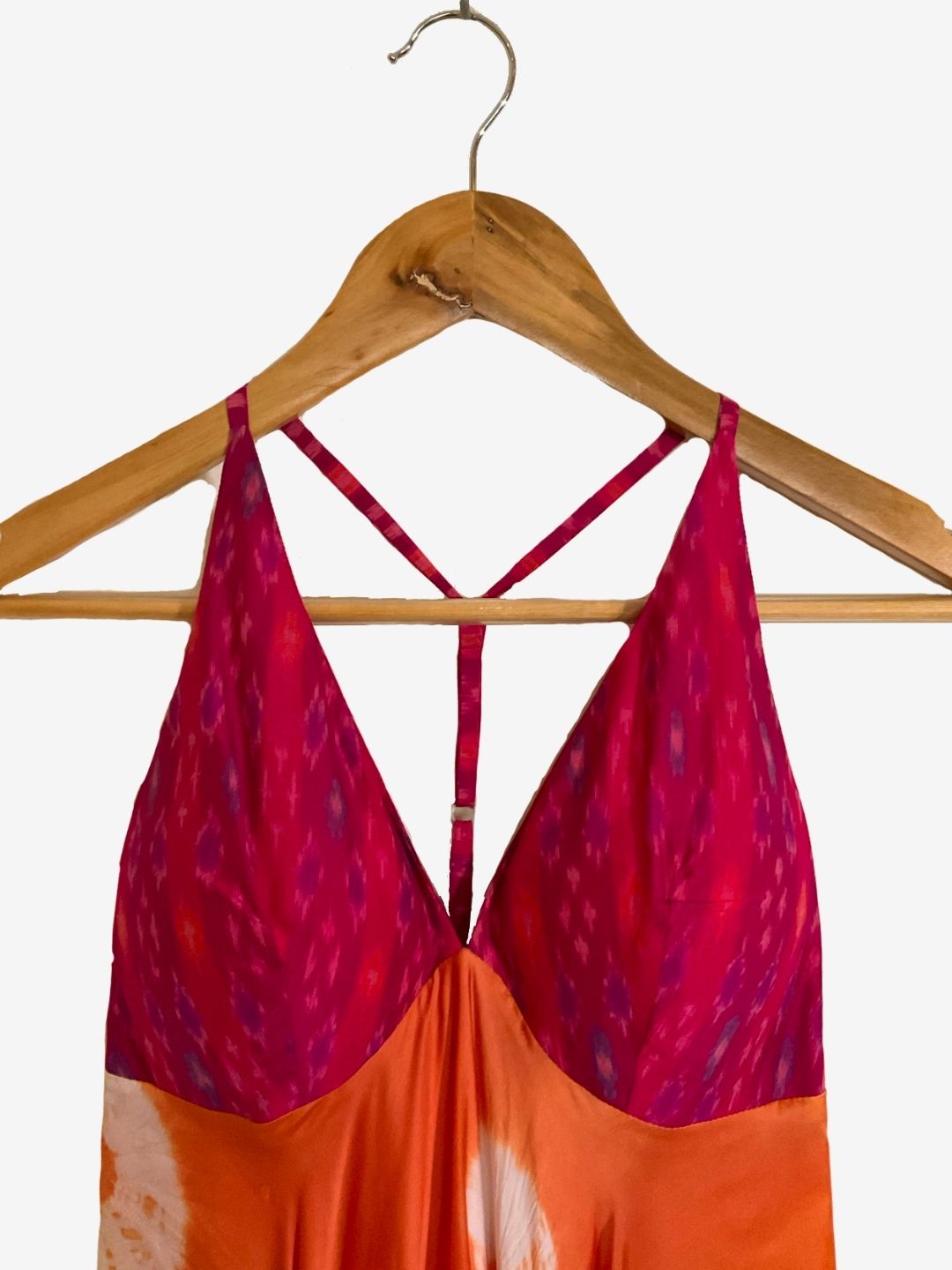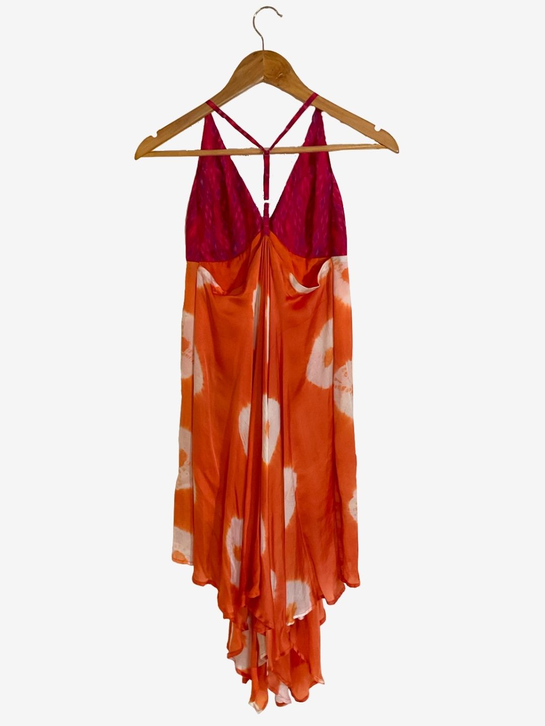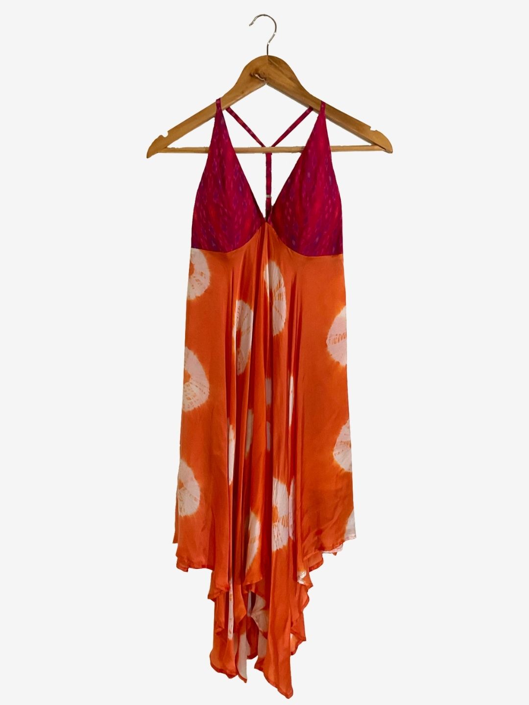 Description: One-of-a-kind asymmetric adjustable strap dress with a blend of cotton and silk ikat